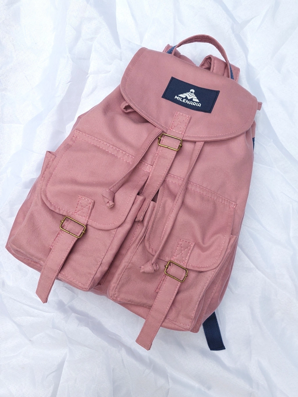Exterior: Dos bolsillos al frente con tapa y uno en espalda con cierre. Correas regulable de nylon, Herrajes metalicos color bronce.