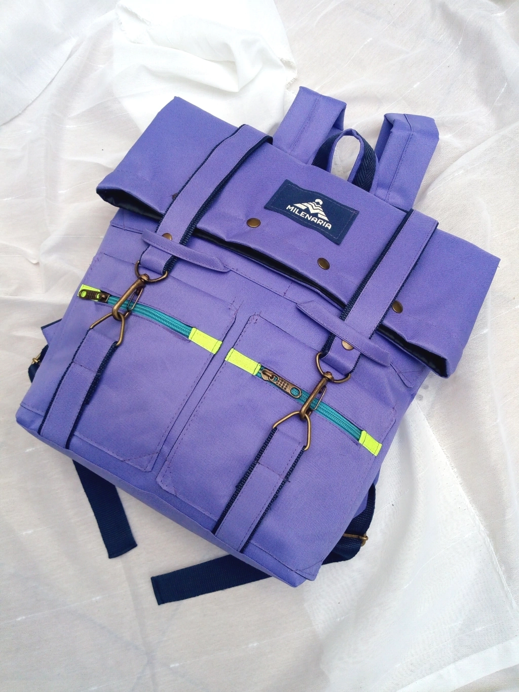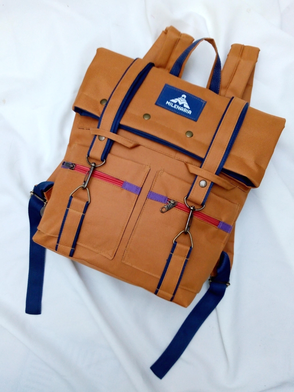 Exterior: Bolsillos al frente y atrás, con cierres. Abertura superior con broches metálicos a presión. Correas regulables. Herrajes de metal en color bronce.